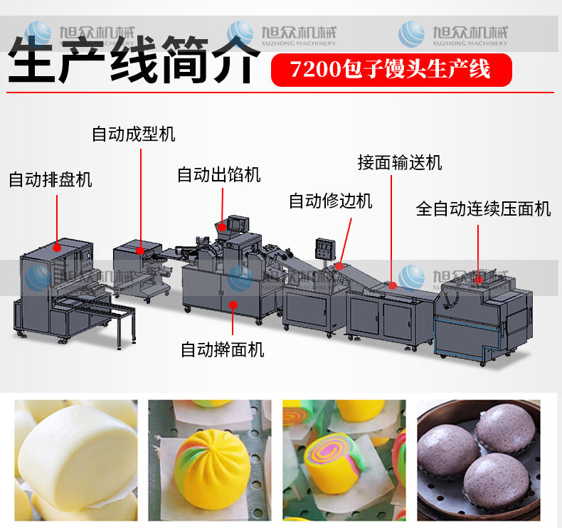 名稱7200包子饅頭生產線 電源380V 功率7.5KW 產量0-3600個/h 尺寸7590X2750X1510mm 重量2100kg 規(guī)格10-100g/個 其他