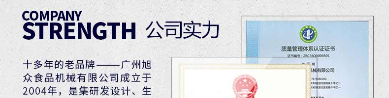 廣州旭眾食品機(jī)械有限公司是一家集科研開發(fā),生產(chǎn)設(shè)計(jì),營(yíng)銷服務(wù)為一體的現(xiàn)代化生產(chǎn)企業(yè)?,F(xiàn)代化生產(chǎn)車間,精湛制造技術(shù),所產(chǎn)機(jī)械歷經(jīng)市場(chǎng)重重考驗(yàn),不斷贏得海內(nèi)外客戶的贊譽(yù)。