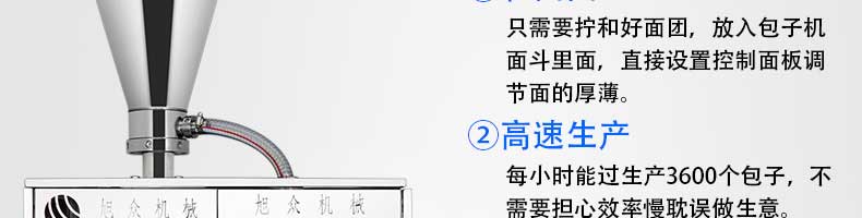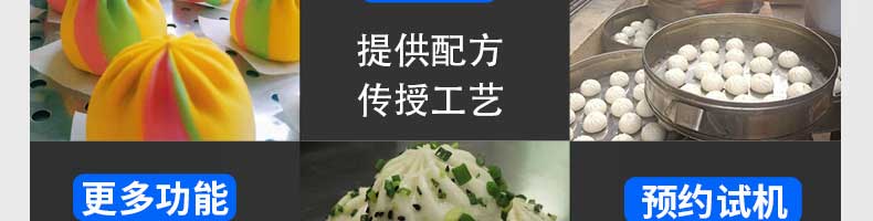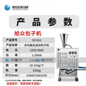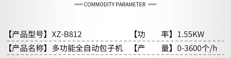 名稱XZ-B812型多功能包子機 電源220V/380V 功率1.55KW 產(chǎn)量0-3600個/h 尺寸1540×710×1635mm 重量250kg 規(guī)格25-130g/個 其他
