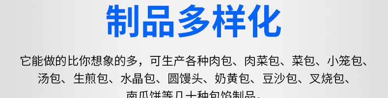XZ-B812型多功能包子機,它能做的比你想象的多,可生產(chǎn)各種肉包、肉菜包、菜包、小籠包、湯包、生煎包、水晶包、圓饅頭、奶黃包、豆沙包、叉燒包南瓜餅等幾十種包餡制品。