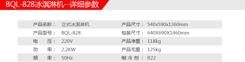 名稱BQL-828立式冰淇淋機(jī) 電源220V 功率2.2kw 產(chǎn)量18-28L/h 尺寸540*590*1360mm 重量118kg 規(guī)格 其他
