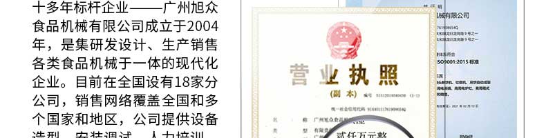 廣州旭眾食品機械有限公司是一家集科研開發(fā),生產設計,營銷服務為一體的現(xiàn)代化生產企業(yè)?,F(xiàn)代化生產車間,精湛制造技術,所產機械歷經市場重重考驗,不斷贏得海內外客戶的贊譽。