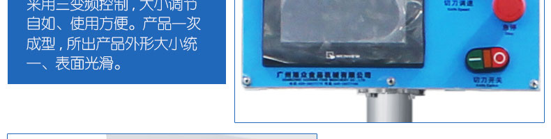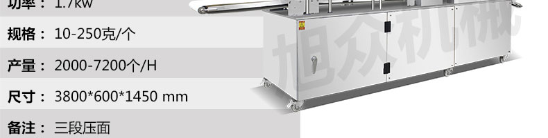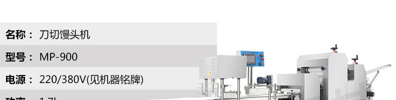 名稱MP900型刀切饅頭成型機(jī) 電源220/380V(見(jiàn)機(jī)器名牌) 功率1.7kw 產(chǎn)量2000-7200個(gè)/小時(shí) 尺寸3800*600*1450mm 重量450kg 規(guī)格10-250克/個(gè) 其他三段壓面