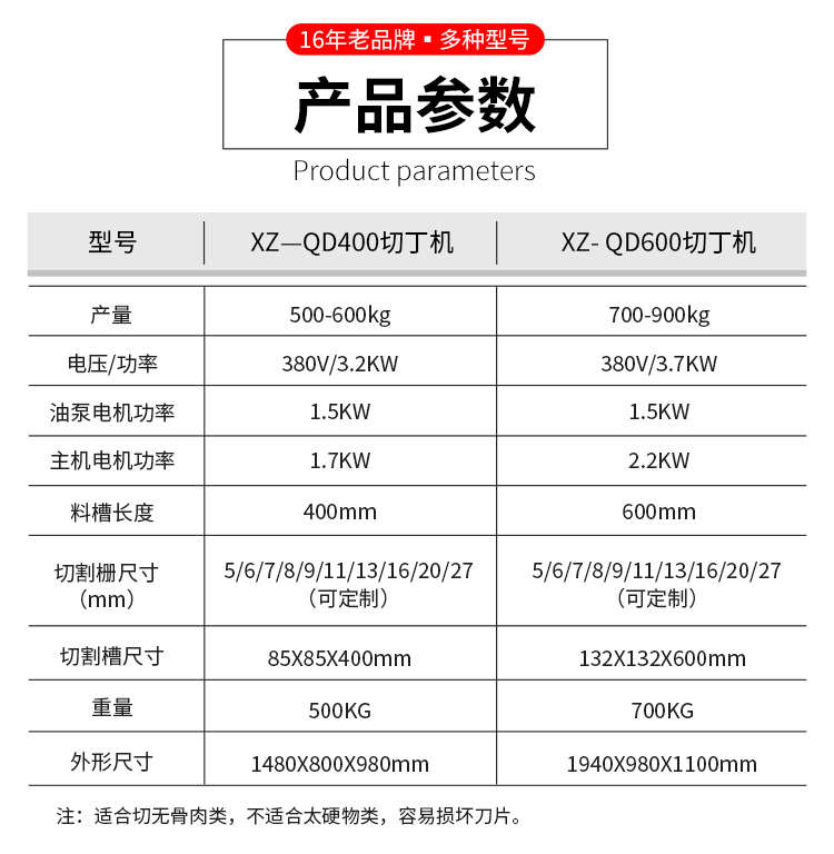 名稱XZ-QD400切丁機(jī) 電源380V 功率主:3.2KW。油泵電機(jī)功率1.5KW,主機(jī)電機(jī)功率1.7KW 產(chǎn)量500-600kg 尺寸切割槽尺寸85X85X400mm,外形尺寸1480X800X980mm 重量500KG 規(guī)格料槽長(zhǎng)度400mm,切割柵尺寸5/6/7/8/9/11/13/16/20/27(mm)(可定制) 其他