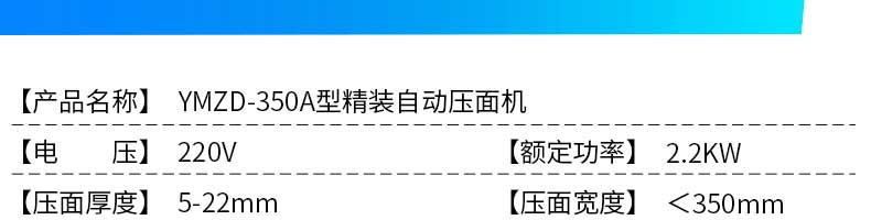名稱YMZD-350A自動(dòng)壓面 電源220V 功率2.2KW 產(chǎn)量700kg/h(最大) 尺寸1130×610×1060mn 重量230kg 規(guī)格【壓面厚度】5-22mm【壓面寬度】<350mm 其他