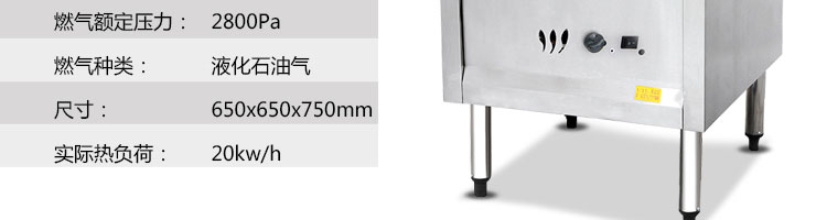 名稱蒸包爐 電源220V 功率20kw 產(chǎn)量 尺寸650*650*750mm 重量25kg 規(guī)格 其他燃?xì)夥N類:液化石油氣;燃?xì)忸~定壓力:2800Pa