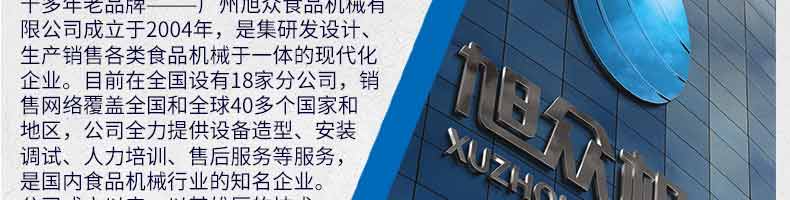 廣州旭眾食品機械有限公司是一家集科研開發(fā),生產(chǎn)設(shè)計,營銷服務(wù)為一體的現(xiàn)代化生產(chǎn)企業(yè)?,F(xiàn)代化生產(chǎn)車間,精湛制造技術(shù),所產(chǎn)機械歷經(jīng)市場重重考驗,不斷贏得海內(nèi)外客戶的贊譽。